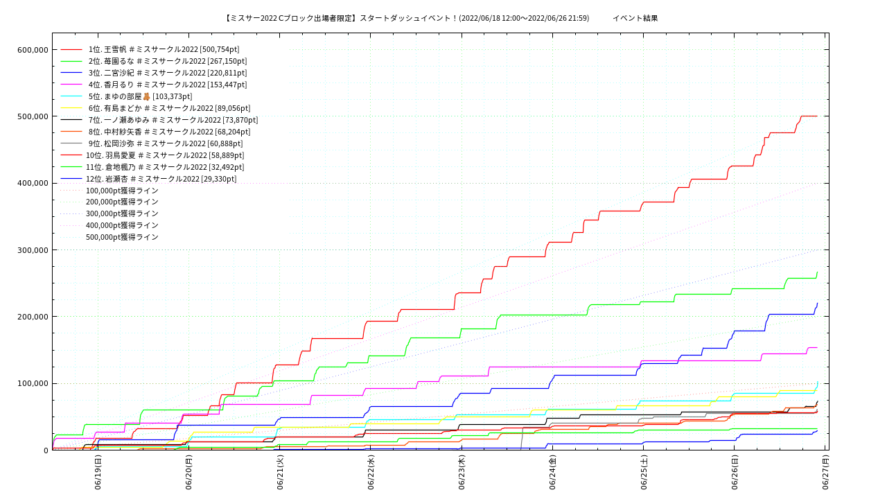 ・当イベントは順位付けの無いレベルイベントですので、参考取得となります。・最高レベルのポイントである150万ptを超えてポイントを獲得し続けた場合、SRのシステム上、表示ポイントが0ptにリセットされます。当サイトではこの仕様上の動作と減算を区別できない為 減算として表示されますが、減算ではありません。予めご承知おきください。