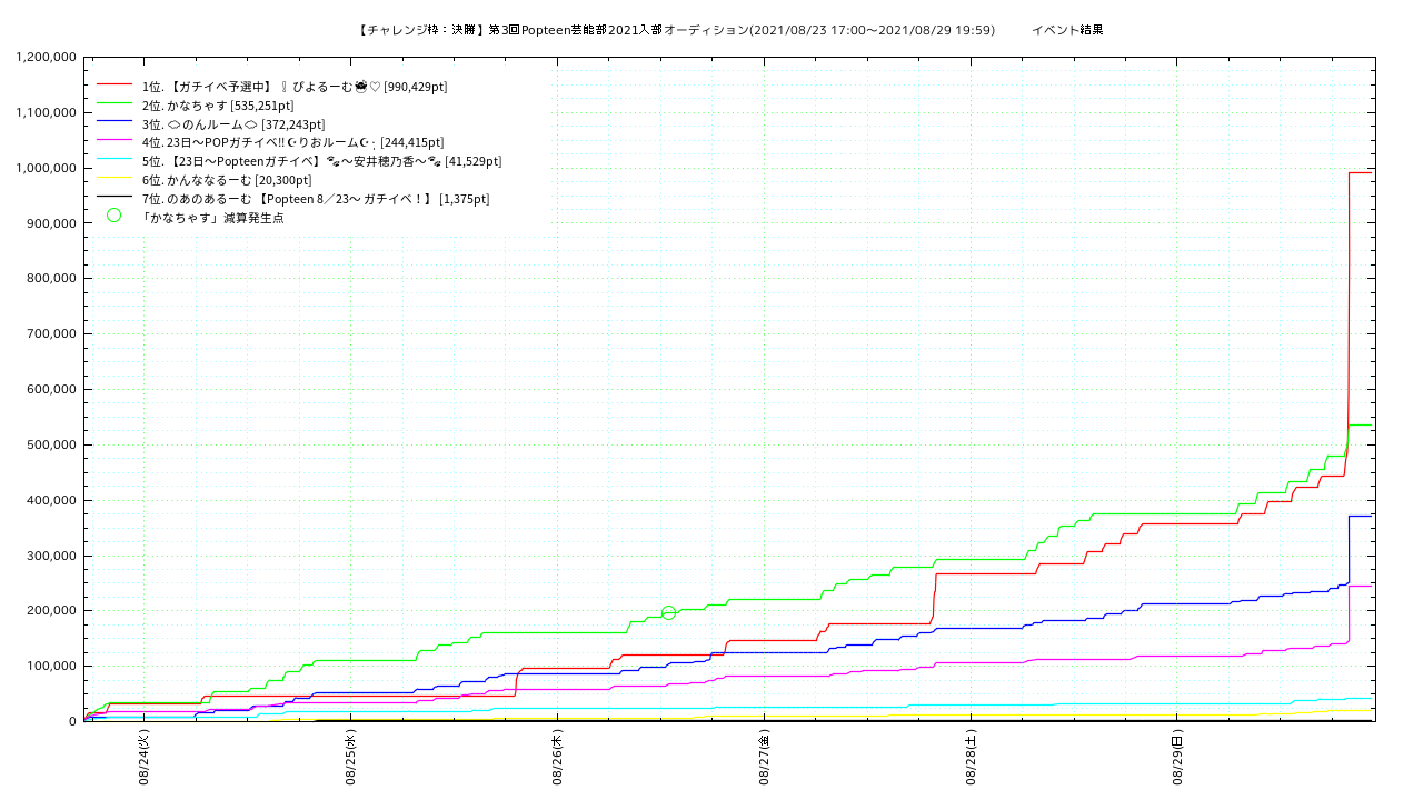 ※減算はあくまでも複数アカウント(重複アカウント)を使用してポイント投入しているユーザの責任となります。減算を受けたルームにとってはデメリットしか有りません。複数アカウントを使用してのイベント支援は決してされませんよう、お願い致します。未確定ですが、多量の減算があった場合は当該ユーザのポイントだけではなく、ルーム全体のポイントに対し一定の割合のペナルティ減算が追加で課せられているケースも有るようです。