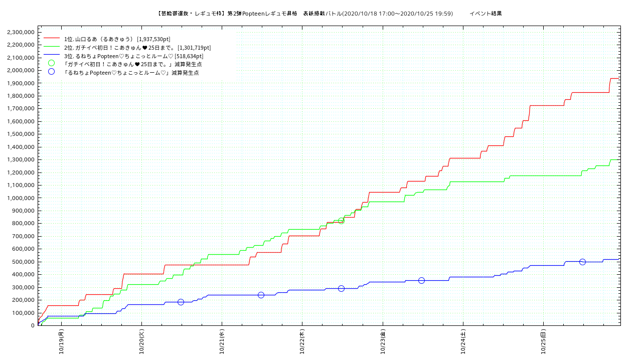 ※減算はあくまでも複数アカウント(重複アカウント)を使用してポイント投入しているユーザの責任となります。減算を受けたルームにとってはデメリットしか有りません。複数アカウントを使用してのイベント支援は決してされませんよう、お願い致します。未確定ですが、多量の減算があった場合は当該ユーザのポイントだけではなく、ルーム全体のポイントに対し一定の割合のペナルティ減算が追加で課せられているケースも有るようです。