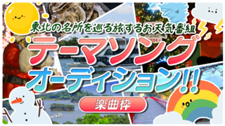 【楽曲枠】旅するお天気番組☆テーマソングオーディション! | weathertohoku2 | NO | NO | 0 | 0 | 9,S,A,B,C | 1 | 2025/10/27 18:00:00 | 2025/11/16 21:59:59 | 40762 | 101 | NO | NO | NO | YES | 2025/10/27 12:02:44 | 開催中 | Level (quest) | 5 | |||