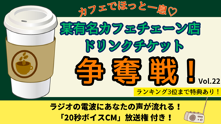 カフェでほっと一息♡某有名カフェチェーン店ドリンクチケット争奪戦!Vol.22 | drink_22 | NO | NO | 0 | 0 | 9,S,A,B,C | 3 | 2026/04/06 18:00:00 | 2026/04/29 21:59:59 | 42088 | 904 | NO | NO | NO | YES | 2026/03/17 17:37:00 | 開催中 | Level (quest) | 31 | |||