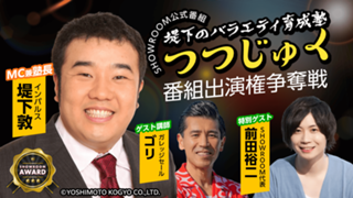 第4回「堤下のバラエティ育成塾 "つつじゅく!"」番組出演権争奪戦 | tsutsuzyuku4 | YES | NO | 0 | 0 | 9,S,A,B,C | 2 | 2025/11/10 18:00:00 | 2025/11/30 21:59:59 | 40900 | 105 | YES | NO | NO | YES | 2025/11/19 16:48:27 | 開催中 | (noncompetition) | 4 | |||