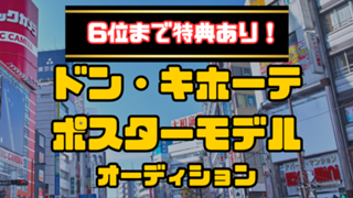 ドン・キホーテ池袋東口駅前店に1ヶ月間掲載! ポスターモデルオーディション | donki_pr2 | NO | NO | 0 | 0 | 9,S,A,B,C | 2 | 2025/11/10 18:00:00 | 2025/11/30 21:59:59 | 40827 | 103 | NO | NO | NO | YES | 2025/11/18 20:28:09 | 開催中 | レベル (quest) | 18 | |||