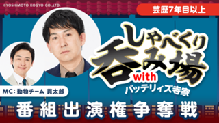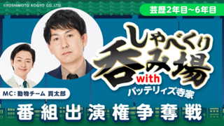 【芸歴7年目以上】「しゃべくり呑み場withバッテリィズ寺家」番組出演権争奪戦 | syabekurinomiba_jike_7 | YES | YES | 0 | 0 | 9,S,A,B,C | 2 | 2026/04/13 18:00:00 | 2026/04/26 21:59:59 | 42307 | 105 | YES | NO | NO | YES | 2026/04/13 15:09:02 | 開催中 | レベル (quest) | 1 | |||