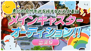 【出演枠】旅するお天気番組☆メインキャスターオーディション! | weathertohoku1 | NO | NO | 0 | 0 | 9,S,A,B,C | 1 | 2025/10/27 18:00:00 | 2025/11/16 21:59:59 | 40761 | 103 | NO | NO | NO | YES | 2025/10/27 13:11:41 | 開催中 | レベル (quest) | 4 | |||