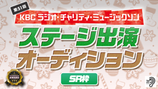 【SR枠】KBC「ラジオ・チャリティ・ミュージックソン」ステージ出演オーディション! | kbc_charity_1 | NO | NO | 0 | 0 | 9,S,A,B,C | 2 | 2025/11/10 18:00:00 | 2025/11/30 21:59:59 | 40803 | 101 | NO | NO | NO | YES | 2025/11/17 13:23:56 | 開催中 | レベル (quest) | 17 | |||