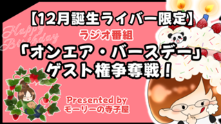 【12月誕生ライバー限定】ラジオ番組「オンエア・バースデー」ゲスト権争奪戦! | morries-birth2512 | NO | NO | 0 | 0 | 9,S,A,B,C | 3 | 2025/11/10 18:00:00 | 2025/11/30 21:59:59 | 40919 | 105 | NO | NO | NO | YES | 2025/11/06 18:17:26 | 開催中 | レベル (quest) | 44 | |||