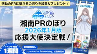 湘南PRのぼり2026年1月版応援大使決定戦! | enoshimataxi_pr16 | NO | NO | 0 | 0 | 9,S,A,B,C | 3 | 2025/10/27 18:00:00 | 2025/11/16 21:59:59 | 40757 | 103 | NO | NO | NO | YES | 2025/10/17 18:25:43 | 開催中 | レベル (quest) | 21 | |||