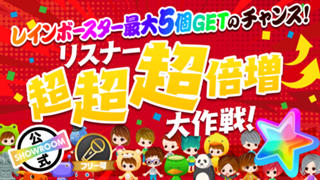 リスナー『超超超』倍増大作戦!ルーム視聴だけでレインボースターGET?!vol.260 | listenerupupup_showroom260 | NO | NO | 0 | 0 | 9,S,A,B,C | 4 | 2025/11/06 18:00:00 | 2025/11/22 21:59:59 | 40661 | 904 | NO | NO | NO | 2D 00:28:02 | YES | 2025/10/06 13:10:40 | 開催中 | レベル (quest) | 49 | ||