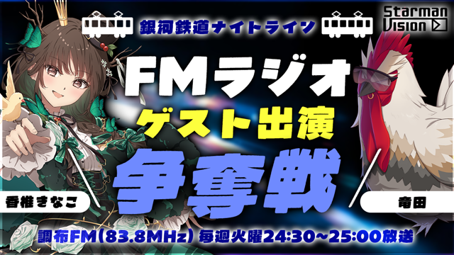 FMラジオ「銀河鉄道ナイトライン」ゲスト出演争奪戦(2026年6月放送) | nightline_202606guest | AllLivers | 3日以上 | レベル | 44 |
