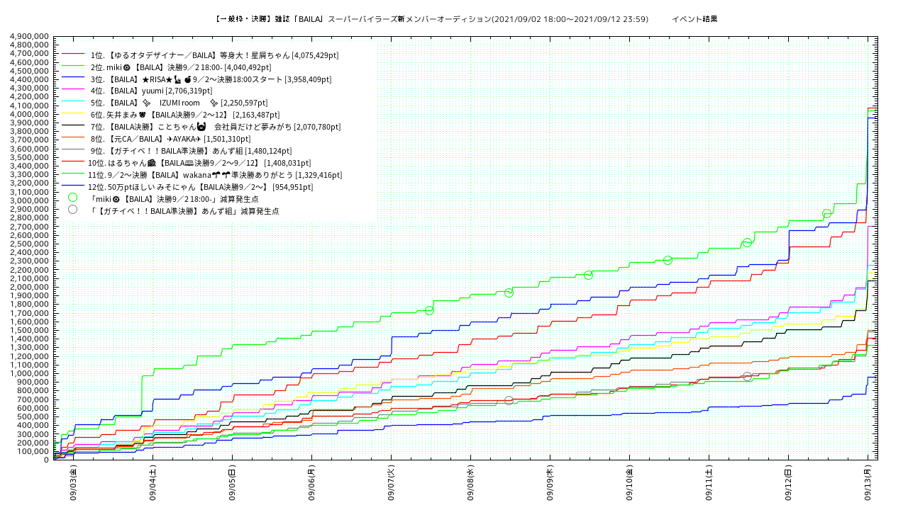 ※減算はあくまでも複数アカウント(重複アカウント)を使用してポイント投入しているユーザの責任となります。減算を受けたルームにとってはデメリットしか有りません。複数アカウントを使用してのイベント支援は決してされませんよう、お願い致します。未確定ですが、多量の減算があった場合は当該ユーザのポイントだけではなく、ルーム全体のポイントに対し一定の割合のペナルティ減算が追加で課せられているケースも有るようです。