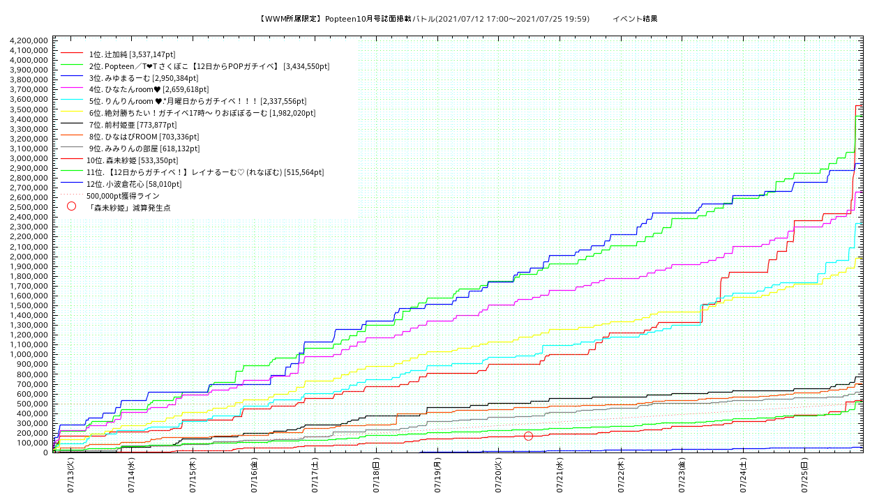 ※減算はあくまでも複数アカウント(重複アカウント)を使用してポイント投入しているユーザの責任となります。減算を受けたルームにとってはデメリットしか有りません。複数アカウントを使用してのイベント支援は決してされませんよう、お願い致します。未確定ですが、多量の減算があった場合は当該ユーザのポイントだけではなく、ルーム全体のポイントに対し一定の割合のペナルティ減算が追加で課せられているケースも有るようです。